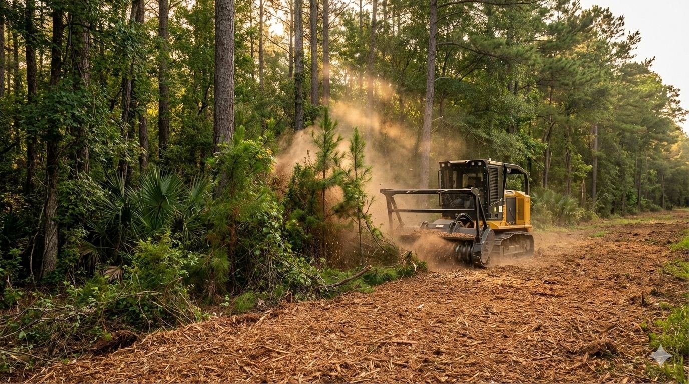 In Laurens County, Georgia, professional land clearing crews use forestry mulchers (250–400 horsepower), bulldozers, tracked excavators, and skid steers with clearing attachments. Equipment selection depends on vegetation type, terrain, and desired outcome — a forestry mulcher excels on brush and small timber while a bulldozer handles large trees and rough grading. Middle Georgia's mix of hardwood, pine, and dense understory often requires more than one equipment type on the same job.
